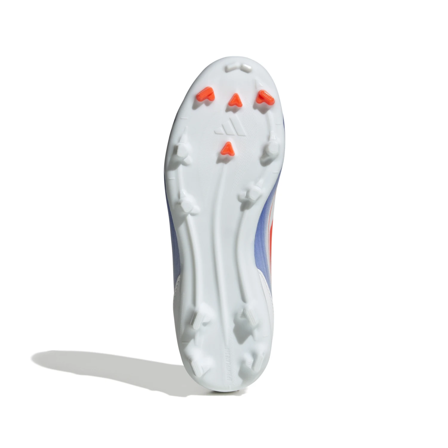 Free the fast with the adidas F50. Created to unlock the full potential of your acceleration, movement and speed. Locking you in with an adaptive laceless collar, the Fiberskin upper on these adidas League soccer cleats for juniors shows off a Sprintgrid print on the forefoot. Down below, the Sprintplate 360 outsole is built for propulsion on multiple surfaces. Heel webbing makes these laceless cleats quick to slip on too.