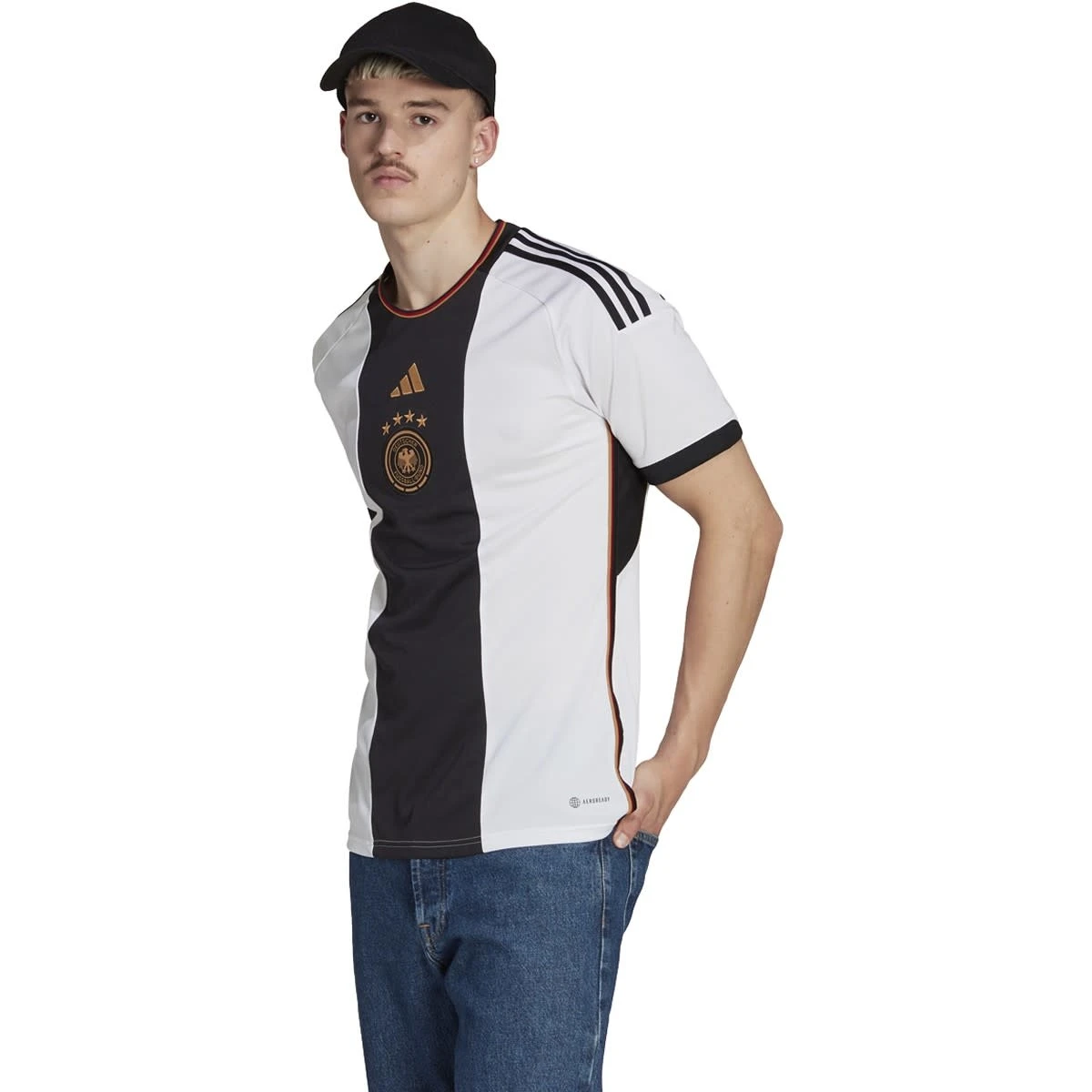 A look to set pulses racing. Placed over the heart and detailed in gold, a woven team badge takes center stage on this adidas Germany soccer jersey. A change of direction for modern home shirts, that bold vertical stripe is filled with national team DNA. Mesh panels and moisture-wicking AEROREADY team up to keep fans comfortable.