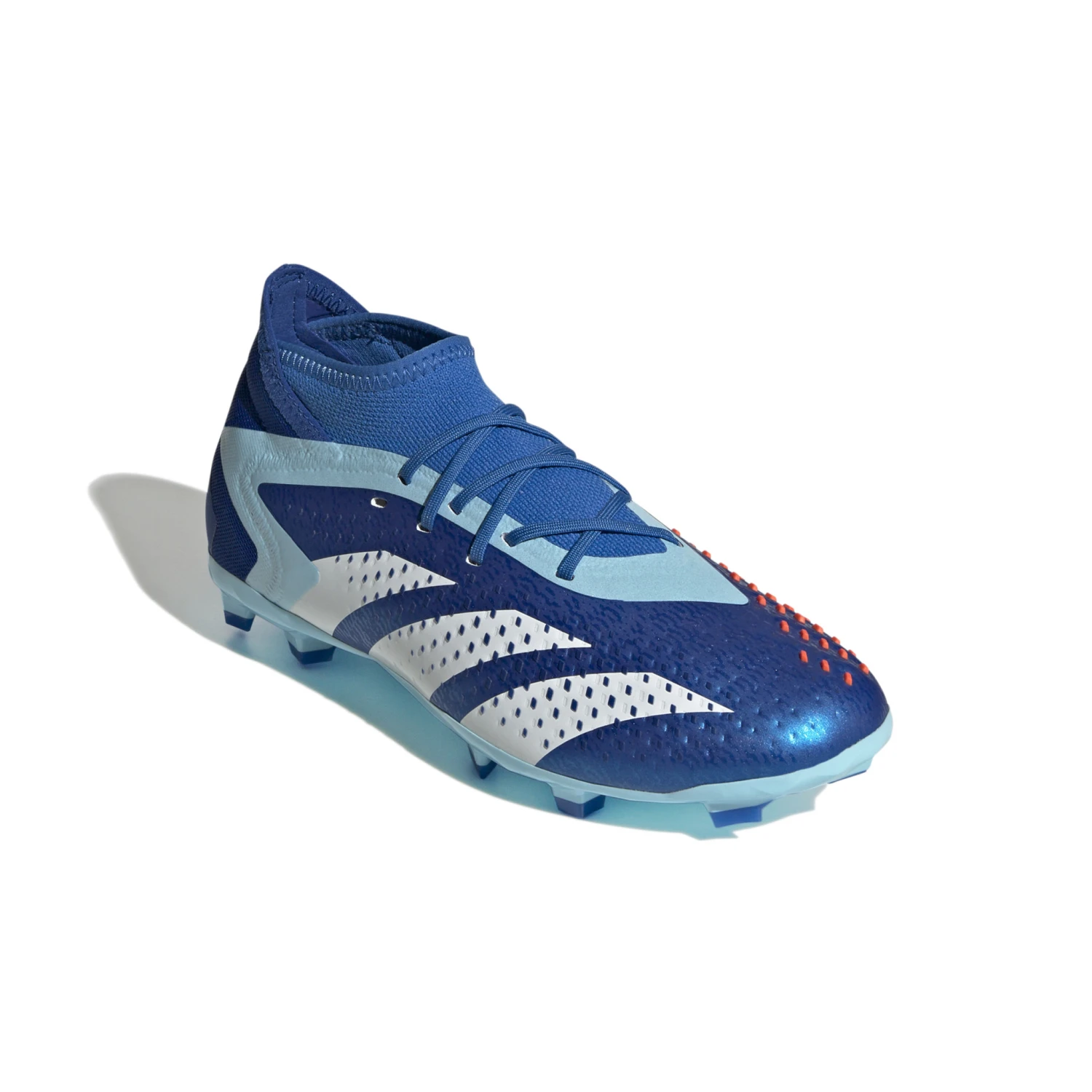 Top corner. Bottom corner. All the corners. adidas Predator Accuracy is crafted for goalscoring, so you know the ball will find the net. The fun’s in choosing how it gets there. These juniors’ soccer cleats have a soft HybridTouch upper with High Definition Grip rubber elements that deliver biting grip on the ball without compromising forefoot flexibility. A specialist outsole keeps you in control on dry grass pitches.