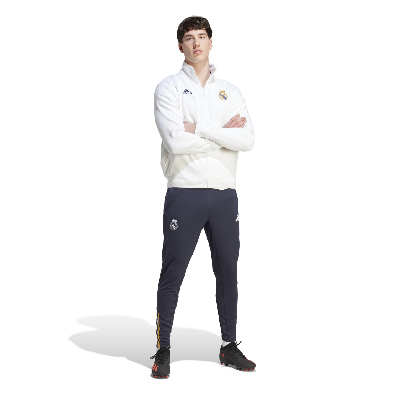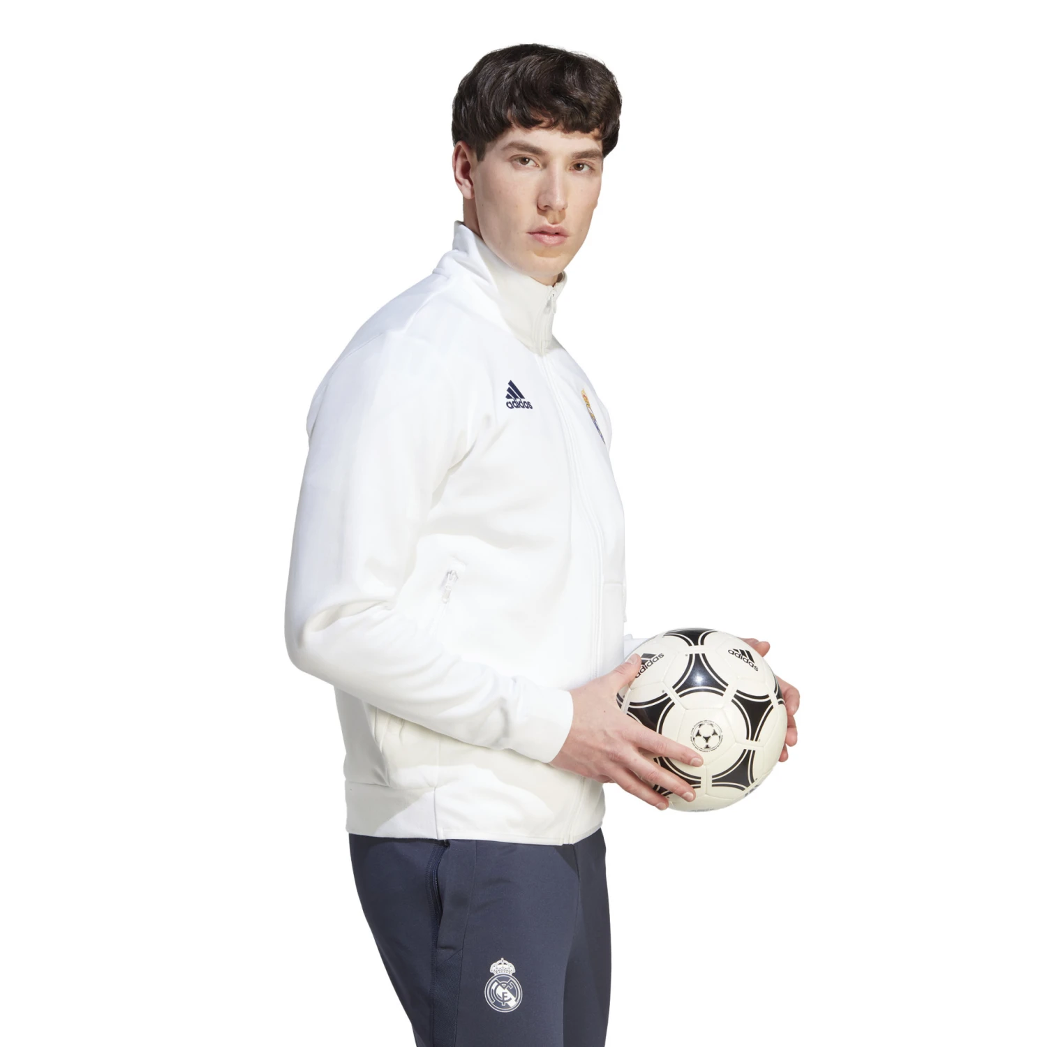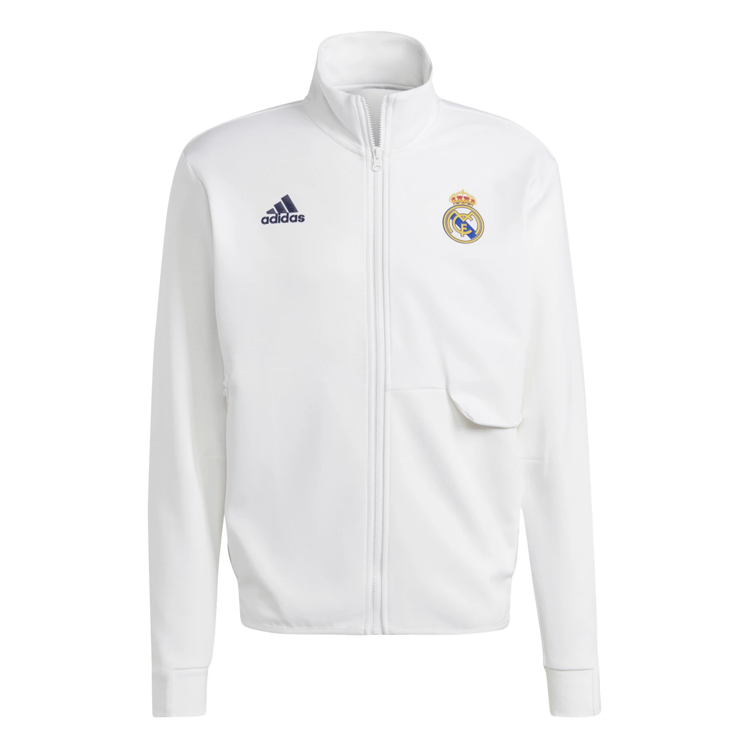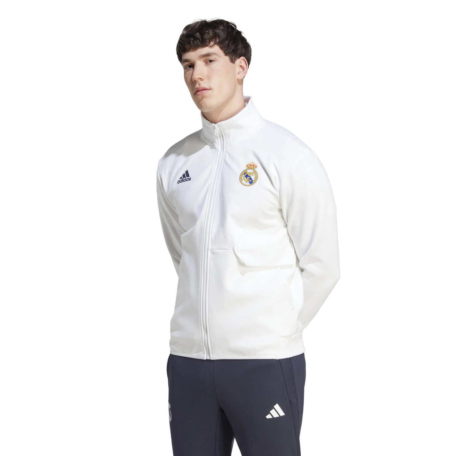 When the pros suit up and head onto the pitch the Real Madrid Anthem Jacket is a sign that world-class talent has entered the arena. With its sleek design and pure club colors, the stylish jacket lets you take the match-day winning mentality wherever you go. Simple and elegant, a classic all-white base is used as the foundation for a full-color crest at the chest, alongside a black adidas logo on the opposite side. One zip pocket and one slip-in pocket ensures space to keep your valuables secure, while the stand-up collar and full-zip is a stylish buffer against the elements. The result? A look that says Real Madrid through and through.