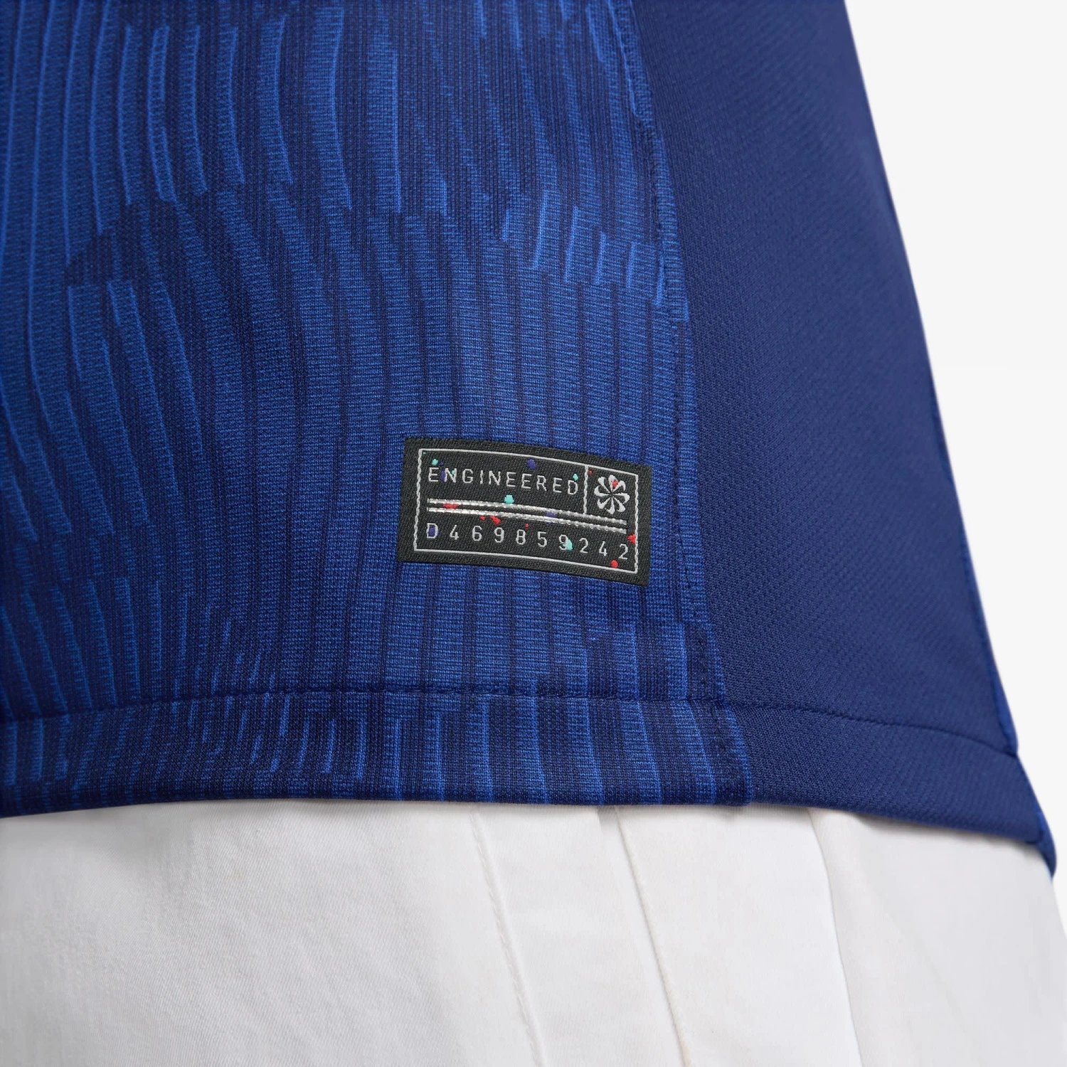 The USWNT 2023 Away jersey is all about the stars and stripes. A red, white and blue colorway adds a touch of national DNA while details at the collar and sleeves pull inspiration from the points of a star to add bold style. Stars over the team crest pair with a hidden graphic on the inside commemorate the team’s unrivaled 4 world championships. Like other jerseys in our Stadium collection, this one pairs replica design details with sweat-wicking technology to give you a game-ready look inspired by your favorite team.